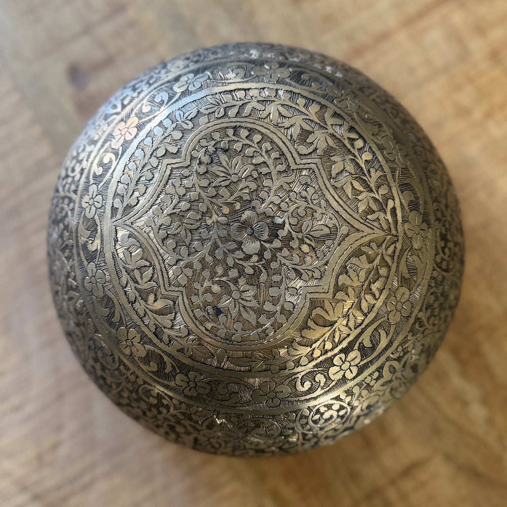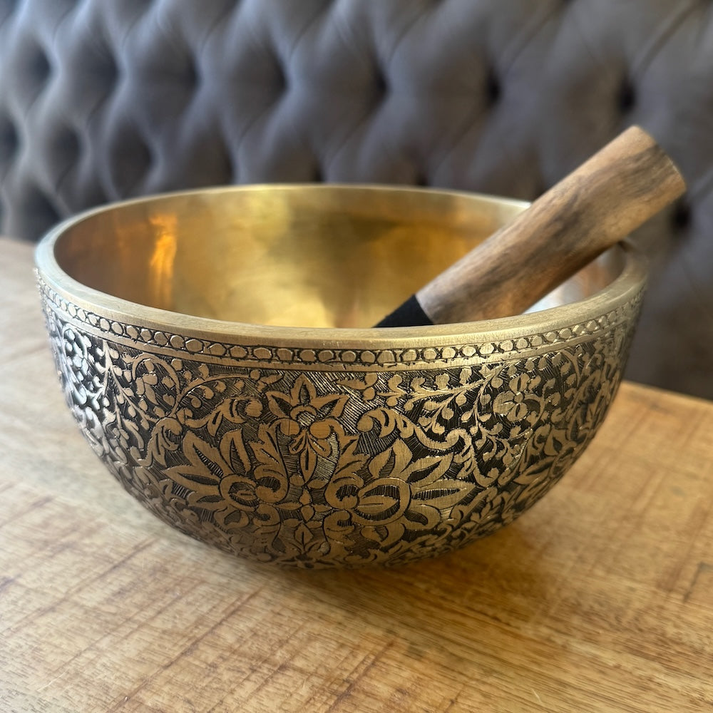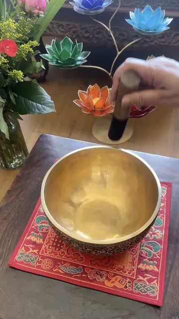 Handgeklopte klankschaal met Lotus gravure. Bijzondere goudkleurige schaal van zware kwaliteit, hij is veel dikker dan reguliere schalen. De buitenzijde en onderzijde zijn met de hand gegraveerd en zwart gepatineerd. De binnenzijde is goudkleurig en zonder versieringen. De buitenzijde is ruw vanwege de diepe gravures en niet glad zoals andere klankschalen.